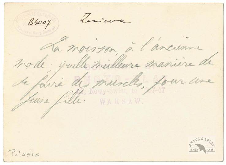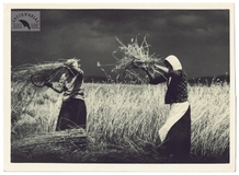 [POLESIE - kobiety przy żniwach - fotografia sytuacyjna]. [l. 30 XX w.]. Fotografia form. 12,8x17,5 cm, wykonana na zlecenie agencji Photo-Plat z Warszawy.