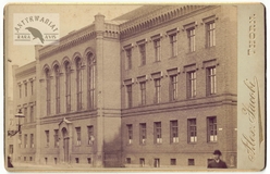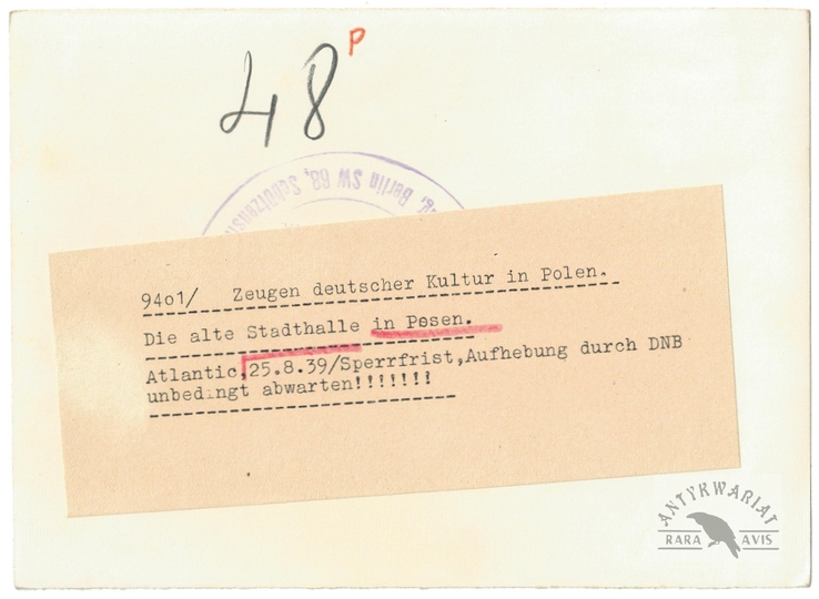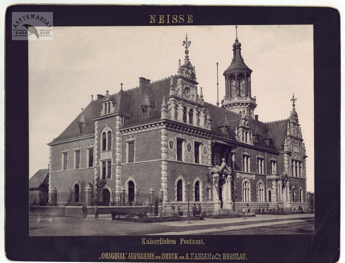[NYSA - gmach Poczty Głównej - fotografia widokowa]. [1899]. Fotografia form. 14,9x20,3 cm na oryg. oryg. podkładzie form. 18,3x23,8 cm, z zakładu A[lfreda] Fabiana & Co we Wrocławiu (Breslau).