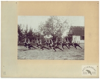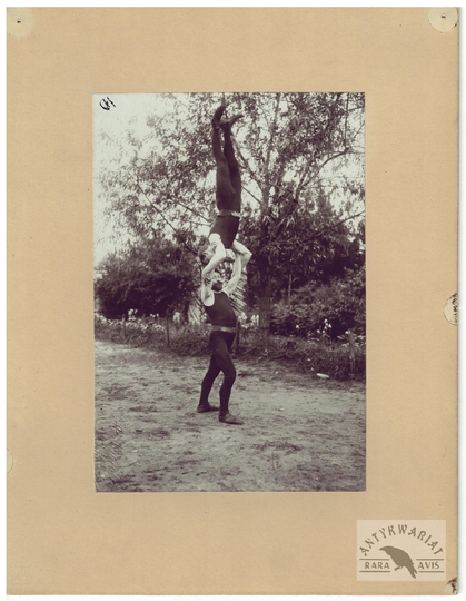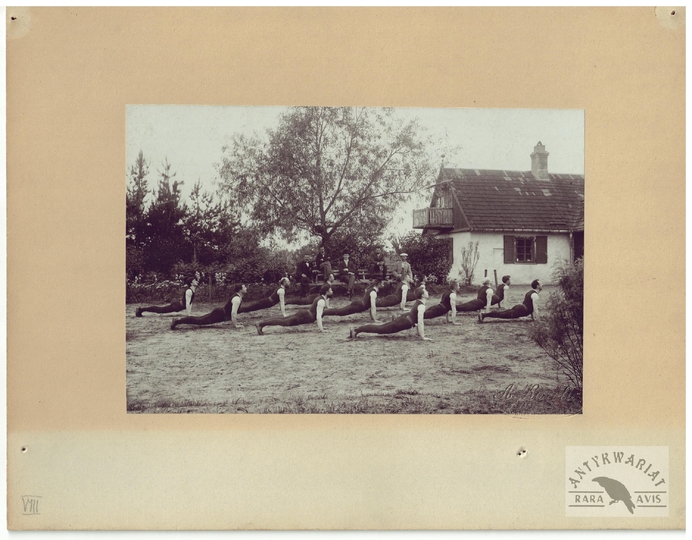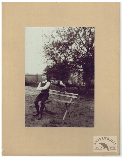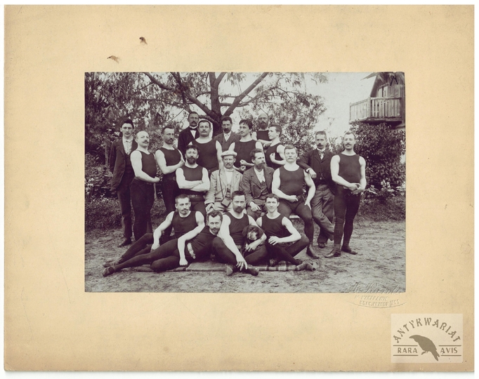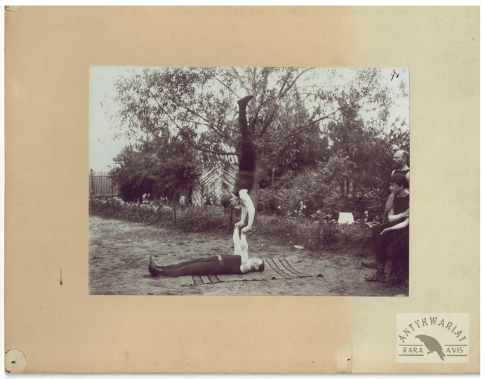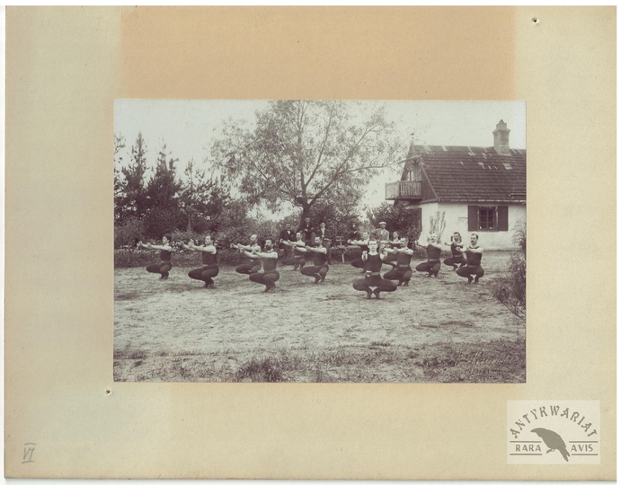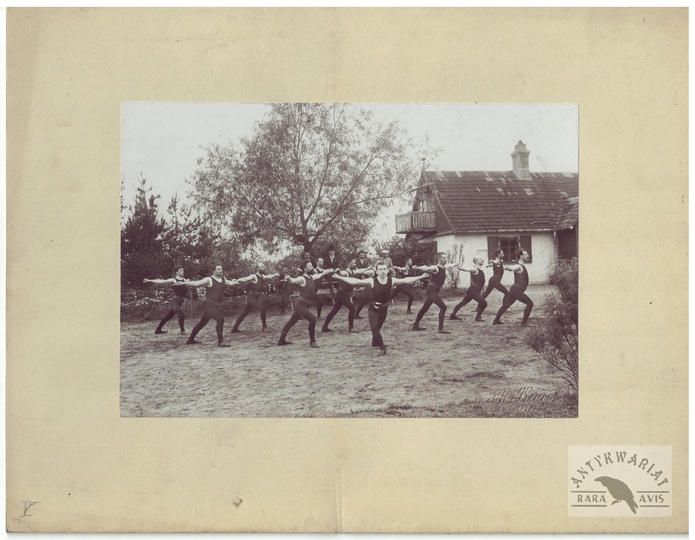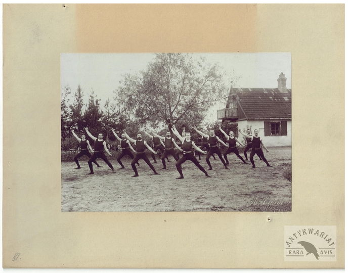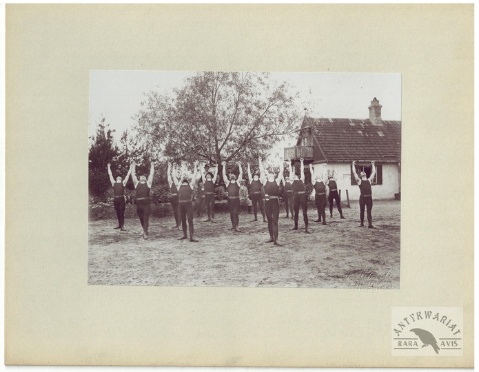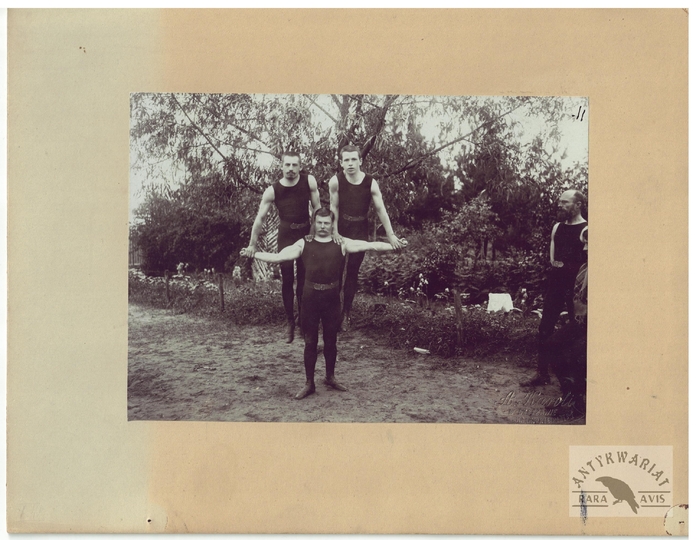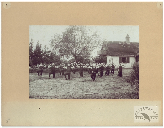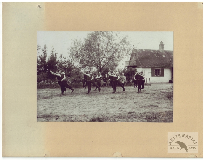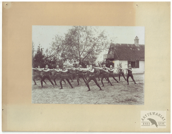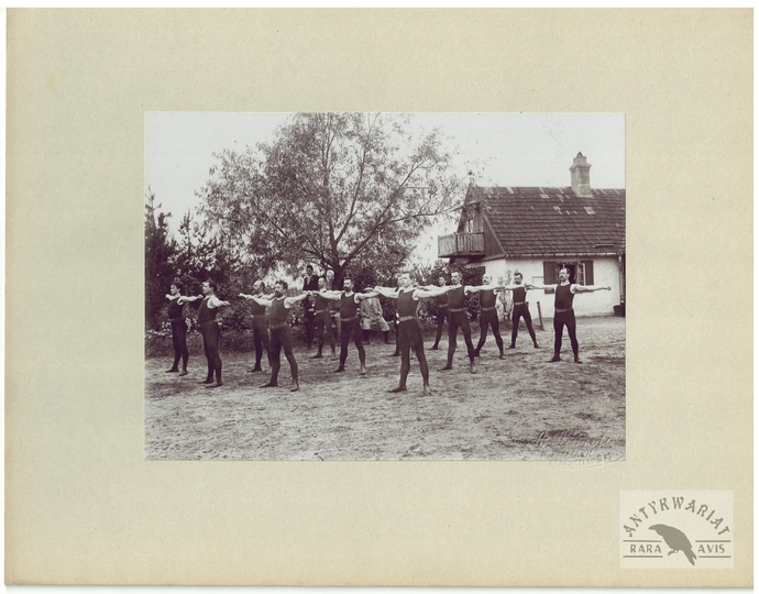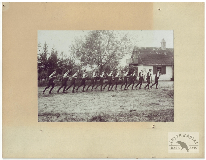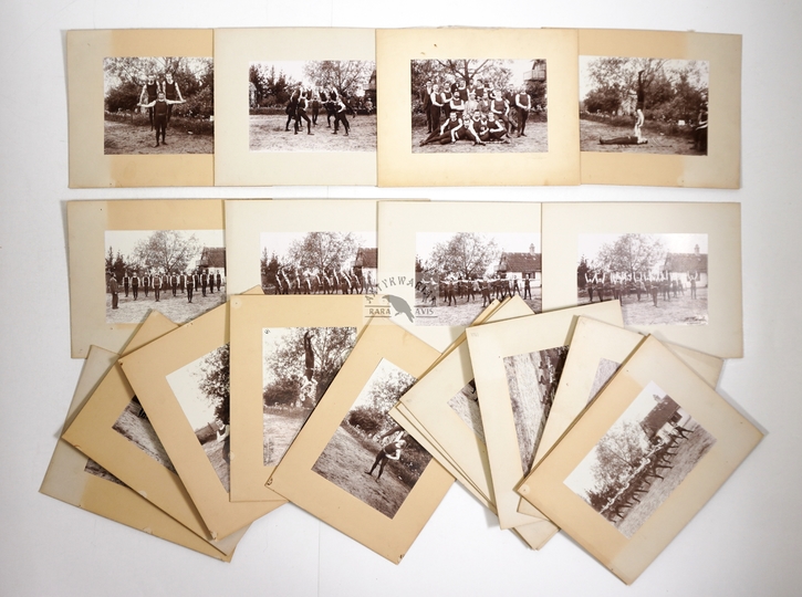 [TOWARZYSTWO Gimnastyczne "Sokół" - ćwiczenia gimnastyczne "sokołów' - fotografie sytuacyjne]. [1. poł. XX w.]. Zestaw 21 fotografii form. ca 11,5x16,5 cm, 17x12 cm na oryg. kartonowych podkładach form. 19,5x25 cm, autorstwa Aleksandra Karolego w Warszawie.