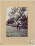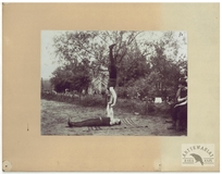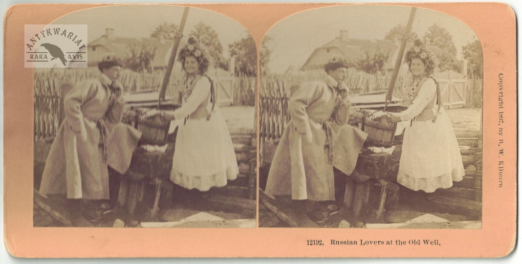 [WARSZAWA, okolice - "Zalotnicy przy starej studni" - fotografia sytuacyjna, widokowa - stereoskopowa]. [1897]. Fotografia form. 7,7x7,7 cm razy dwa na oryg. podkładzie form. 8,9x17,8 cm, autorstwa Melecjusza Dutkiewicza w Warszawie, wydane przez firmę Kilburn Brothers Stereoscopic View Company w Littleton.