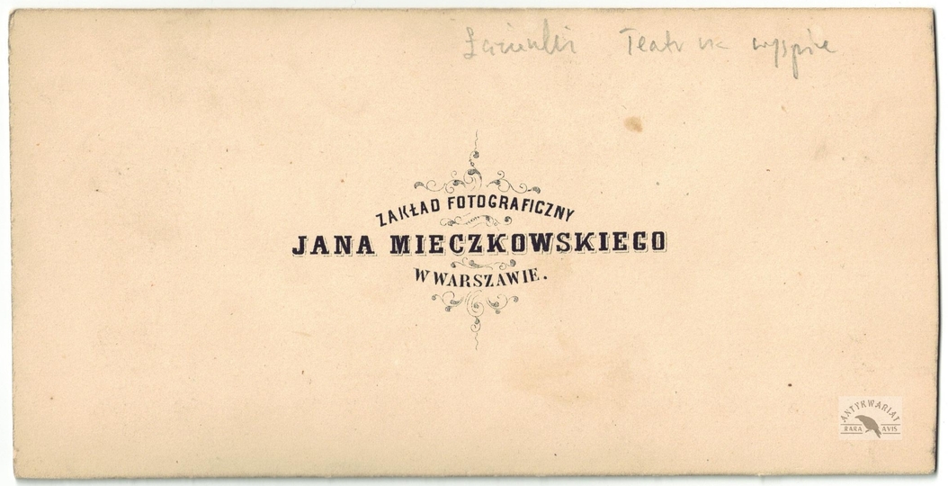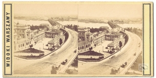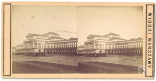 [WARSZAWA - widok na Plac Teatralny z gmachem Teatru Wielkiego - fotografia widokowa - stereoskopowa]. [l. 60. XIX w.]. Fotografia form. 7,6x7,3 cm razy dwa na oryg. podkładzie form. 8,6x17,3 cm, autorstwa Jana Mieczkowskiego w Warszawie.