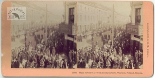 [WARSZAWA - główna ulica dzielnicy żydowskiej - fotografia sytuacyjna, widokowa - stereoskopowa]. [1897]. Fotografia form. 7,7x7,7 cm razy dwa na oryg. podkładzie form. 8,9x17,8 cm, autorstwa Melecjusza Dutkiewicza w Warszawie, wydane przez firmę Kilburn Brothers Stereoscopic View Company w Littleton.