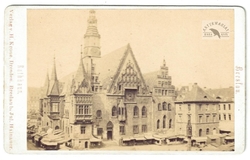 [WROCŁAW - rynek i Stary Ratusz - fotografia widokowa - ujęcie w formacie card de viste]. [1865/przeł. l. 70./80. XIX w.]. Fotografia form. 5,9x8,7 na oryg. podkładzie form. 6,2x10,1 cm, autorstwa H[ermanna] Krone z Drezna, wydana przez Jul[iusa] Hainauera we Wrocławiu (Breslau).