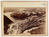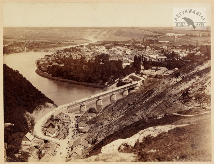 [ZALESZCZYKI - most drogowy nad Dniestrem w Zaleszczykach - fotografia widokowa]. [nie po 1898]. Fotografia form. 17x22,8 cm na oryg. podkładzie form. ca 19x25 cm, autorstwa T[adeusza Juliana] Jaworskiego.