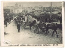 [I WOJNA św. - tabory ukraińskie opuszczające Kamieniec Podolski - fotografia prasowa, sytuacyjna]. [1914/1918]. Fotografia form. ca 13x18 cm, nieznanego autorstwa.