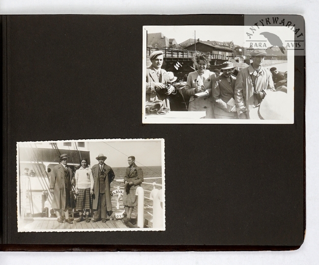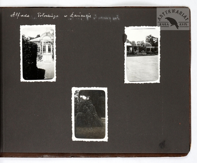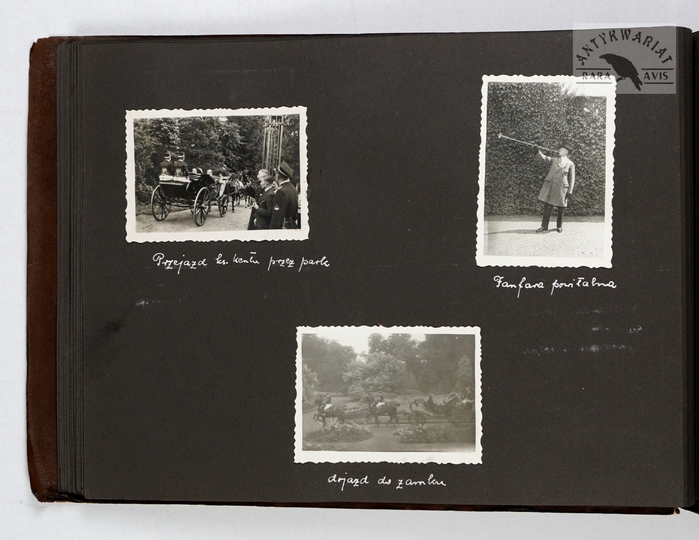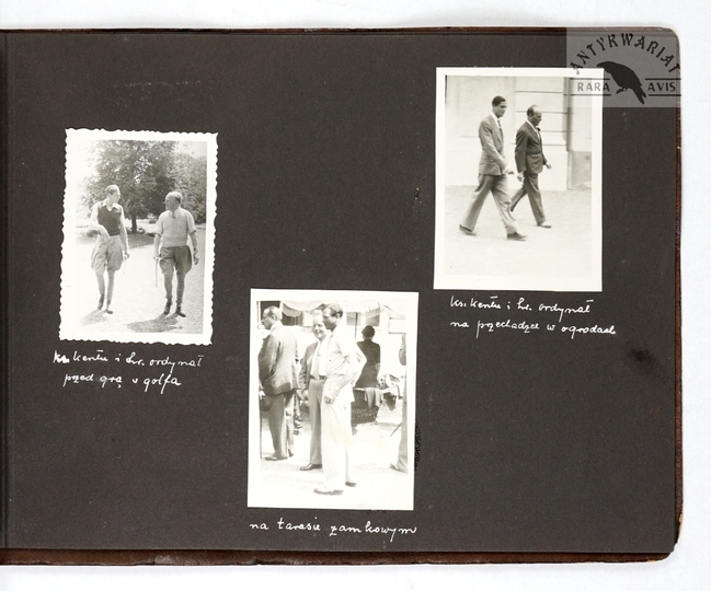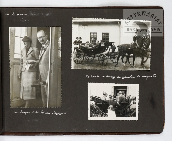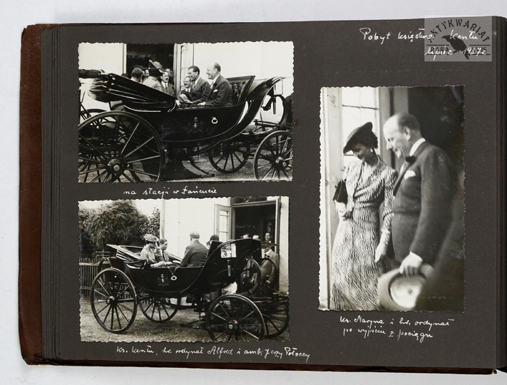 [ARYSTOKRACJA - ostatni ordynat łańcucki Alfred Potocki przyjmuje w łańcuckiej rezydencji księcia Kentu Jerzego z małżonką Mariną - fotografie sytuacyjne]. [VII 1937]. Zestaw 22 fotografii form. ca 13,5x8,5 cm, 9x13 cm, 6x8,5 cm, 9x7cm na 5 kartach z albumu.