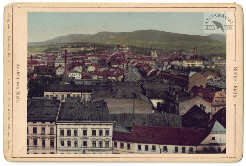[BIELSKO-BIAŁA - fragment panoramy miasta - fotografia widokowa - ujęcie w formacie gabinetowym]. [1. poł. XX w.]. Fotografia form. 10x14,2 cm, na oryg. podkładzie form. 11,4x17,1 cm, wydawnictwo B. Machaliza, Bielitz.