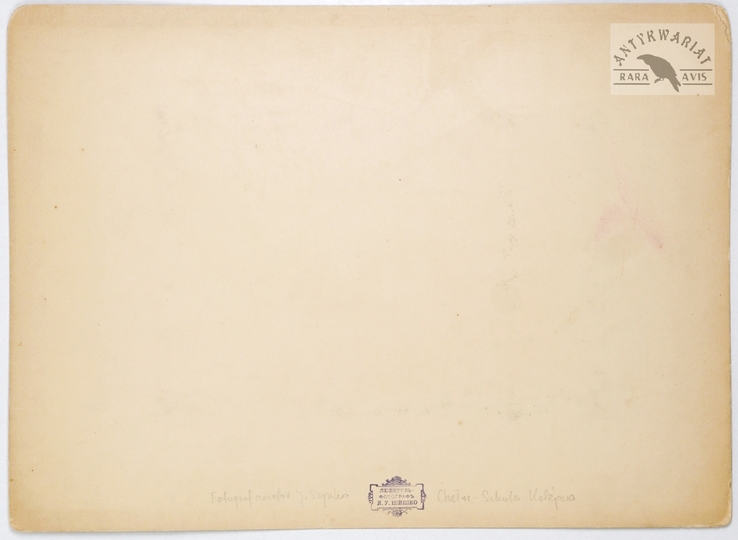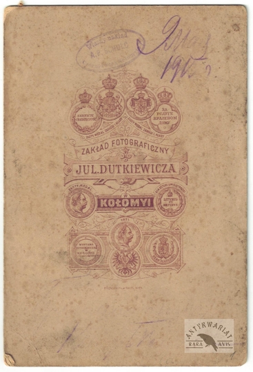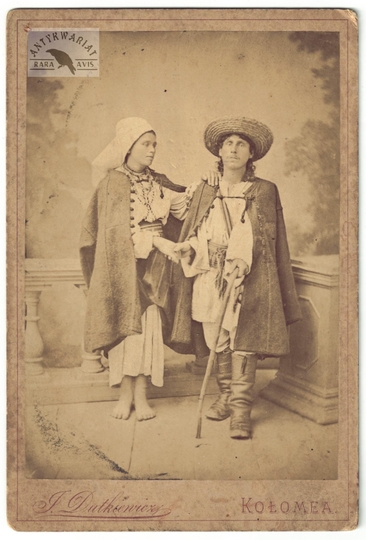 [HUCULSZCZYZNA - Kołomyja - typy Hucułów - fotografia pozowana - ujęcie w formacie gabinetowym]. [nie przed 1871]. Fotografia form. 13,7x9,5 cm na oryg. podkładzie form. 16x10,8 cm, autorstwa J[uliusza] Dutkiewicza w Kołomyi.