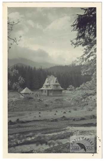 [GÓRY - Karpaty - Beskidy Wschodnie - Gorgany - nieistniejące schronisko PTT "U źródeł Świcy") - fotografia widokowa]. [l. 30. XX w.]. Fotografia form. 13,8x8,8 cm, autorstwa Adama Lenkiewicza.
