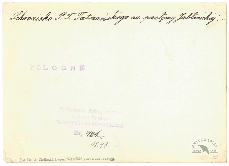 [GÓRY - Karpaty - Beskidy Wschodnie - Gorgany - nieistniejące schronisko PTT na Przełęczy Tatarskiej (Jabłonickiej) - fotografia widokowa]. [nie przed 1932]. Fotografia form. 12,8x17,9 cm, autorstwa A[dama] Zielińskiego.