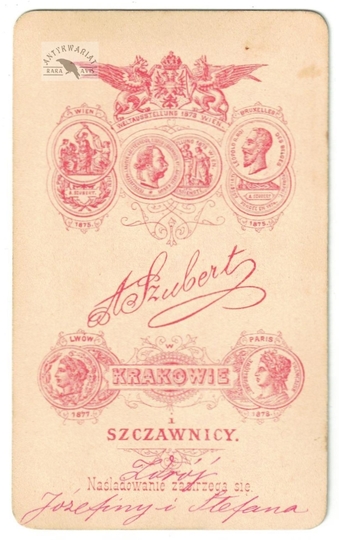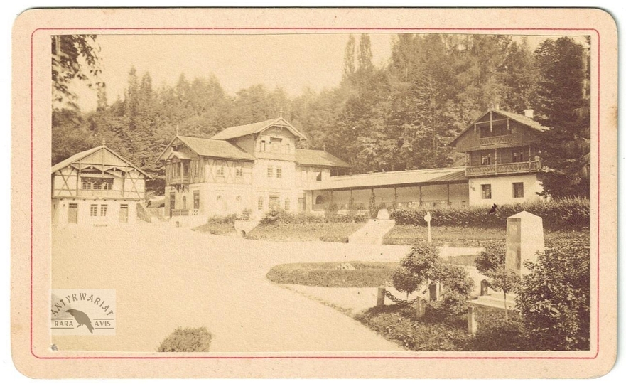 [GÓRY - Karpaty - Pieniny - Szczawnica - Zdrój Józefiny i Stefana - fotografia widokowa - ujęcie w formacie card de visite]. [l. 70./80 XIX w.?]. Fotografia form. 5,5x9,4 cm na oryg. podkładzie form. 6,5x10,6 cm, autorstwa A[wita] Szuberta w Krakowie i Szczawnicy.
