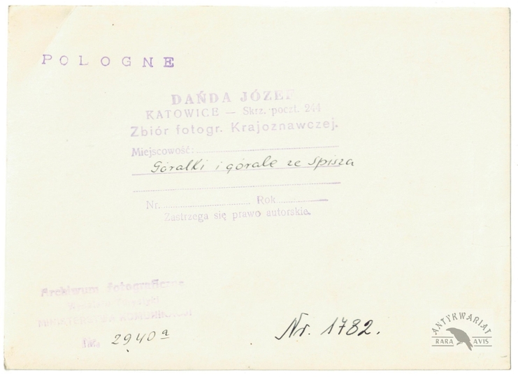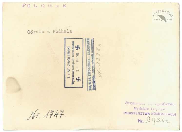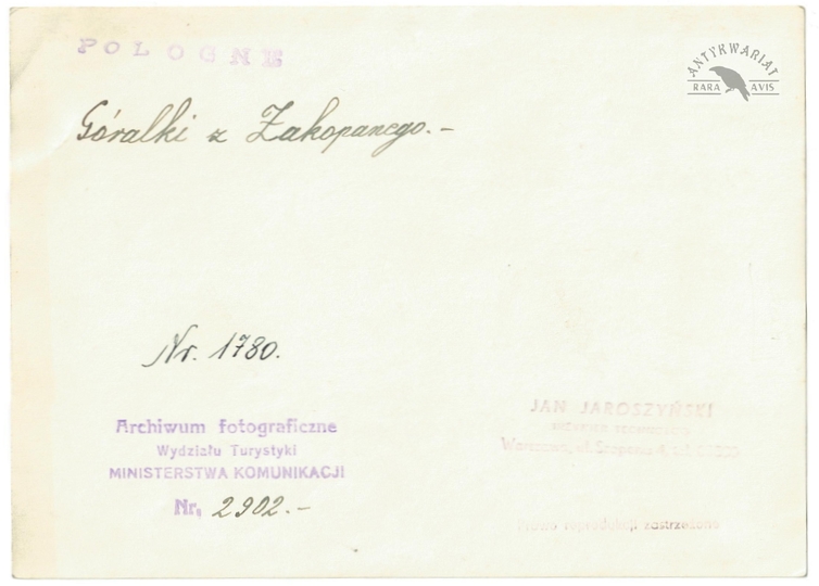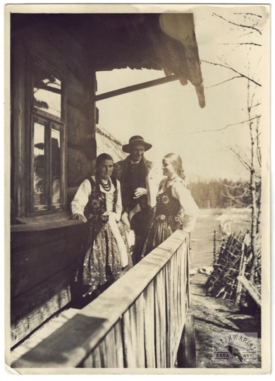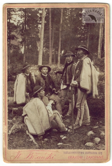 [GÓRY - Karpaty - Tatry - górale z Podhala - fotografia pozowana, sytuacyjna]. [l. 30. XX w.]. Fotografia form. 17,8x12,9 cm, autorstwa T[adeusza] i S[tefana] Zwolińskich w Zakopanem.