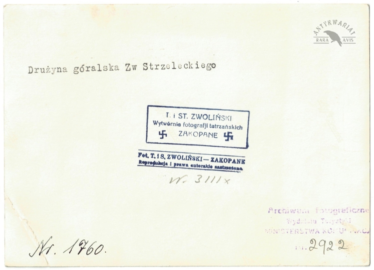 [GÓRY - Karpaty - Tatry - drużyna góralska Związku Strzeleckiego - fotografia pozowana, sytuacyjna]. [l. 30. XX w.]. Fotografia form. 12,8x18 cm, autorstwa T[adeusza] i S[tefana] Zwolińskich w Zakopanem.