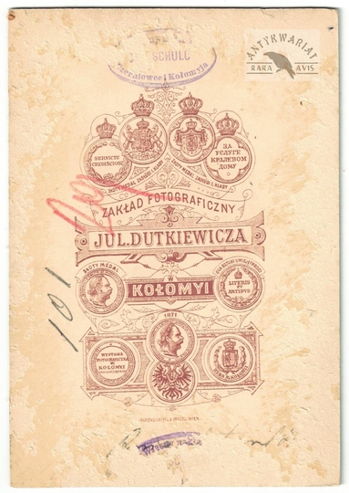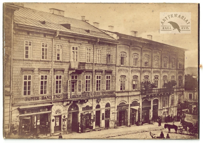 [KOŁOMYJA - rynek - fotografia widokowa, sytuacyjna]. [nie przed 1871]. Fotografia form. 9,5x13,6 cm na oryg. podkładzie form. 9,5x13,6 cm, autorstwa J[uliusza] Dutkiewicza w Kołomyi.