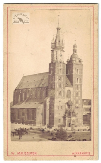 [KRAKÓW - Kościół archiprezbiterialny p.w. Wniebowzięcia Najświętszej Maryi Panny - fotografia widokowa, sytuacyjna - ujęcie w formacie card de visite]. [nie po 1885]. Fotografia form. 8,9x5,5 cm na oryg. podkładzie form. 10,7x6,5 cm, autorstwa Walerego Maliszewskiego w Krakowie.