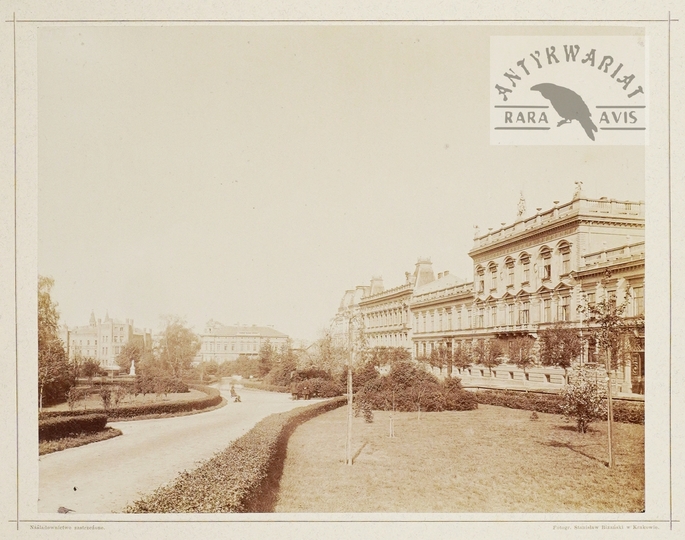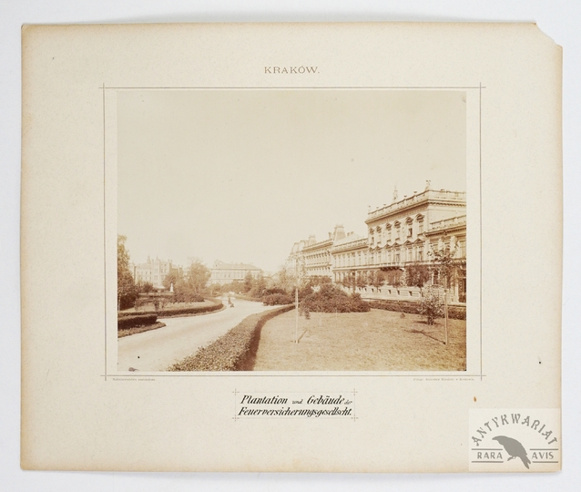 [KRAKÓW - widok na Planty i Zakład Ubezpieczeń Przeciwpożarowych przy ul. Basztowej - fotografia widokowa - ujęcie w dużym formacie]. [2. poł. XIX w.]. Fotografia form. 20,5x25,8 cm na oryg. podkładzie form. ca 32,5x40 cm, z zakładu Stanisława Bizańskiego.