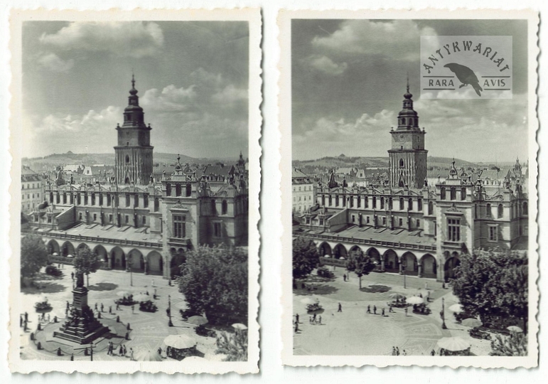[KRAKÓW - fragment Rynku Głównego od wschodniej strony Sukiennic Z i BEZ pomnika Adama Mickiewicza - fotografie widokowe]. [l. 30. i 40. XX w.]. Zestaw 2 fotografii form. 8,5x6 cm, autorstwa Stanisława Kolowca z Krakowa.