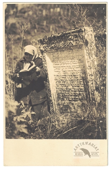 [KRZEMIENIEC - kobieta przy macewie - fotografia widokowa]. [l. 30. XX w]. Fotografia form. 13,4x8,5 cm, autorstwa Henryka Hermanowicza.