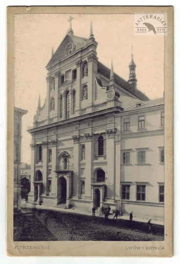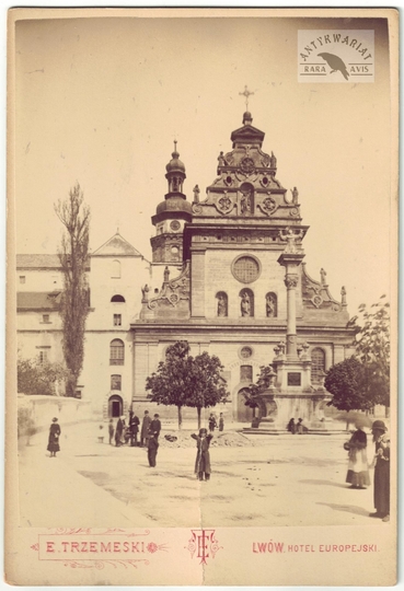 [LWÓW - kościół św. Piotra i Pawła oraz klasztor Jezuitów - fotografia widokowa - ujęcie w formacie gabinetowym]. [nie przed 1887]. Fotografia form. 15x9,9 cm na oryg. podkładzie form. 16,6x11,1 cm, autorstwa Edwarda Trzemeskiego we Lwowie.