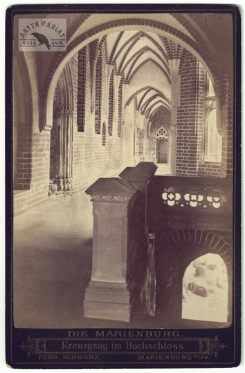 [MALBORK - Krużganek w Wysokim Zamku - fotografia widokowa - ujęcie w formacie gabinetowym]. [nie po 1898]. Fotografia form. 14,4x10 cm na oryg. podkładzie form. 16,7x10,8 cm, z zakładu Ferd[inanda] Scharza w Malborku (Marienburg).