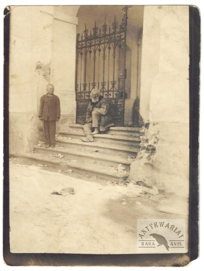 [OSTROV - dziad proszalny przed kościołem - fotografia sytuacyjna]. [1. poł. XX w.]. Fotografia form. 11,8x8,8 cm.