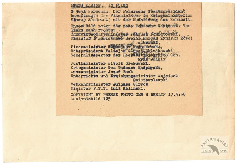 [POLITYKA - Rząd Felicjana Sławoja Składkowskiego z Edwardem Śmigłym-Rydzem po zaprzysiężeniu - fotografia pozowana, prasowa]. [V 1936]. Fotografia form. 16,4x23,8 cm.