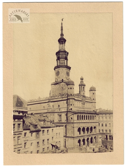 [POZNAŃ - ratusz - fotografia widokowa - ujęcie w formacie gabinetowym]. [2. poł. XIX w.]. Fotografia form. 14,2x10,1 cm na oryg. podkładzie form. 16,4x12,2 cm, wykonane najprawdopodobniej w zakładzie [Emilii Mirskiej w Poznaniu].