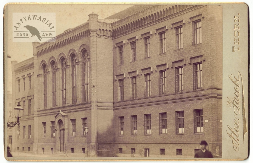 [TORUŃ - Ratusz Staromiejski - fotografia widokowa, sytuacyjna - ujęcie w formacie gabinetowym]. [k. XIX w.]. Fotografia form. 10,2x14,4 cm na podkładzie form 10,6x16,5 cm, wykonane w atelier Alex[andra] Jacobi w Toruniu (Thorn).