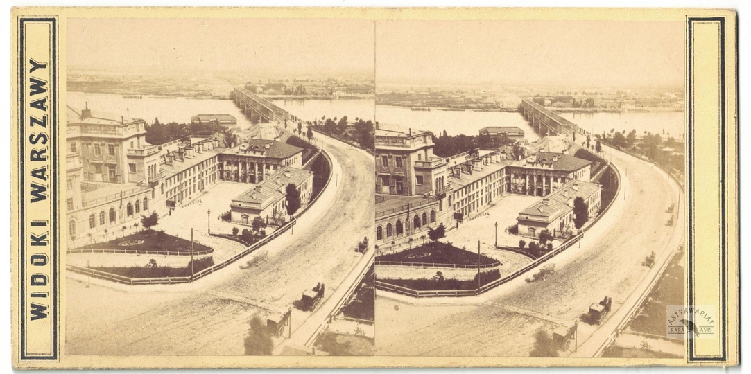 [WARSZAWA - widok na Nowy Zjazd z mostem Kierbedzia i Pragę - fotografia widokowa - stereoskopowa]. [nie przed 1864]. Fotografia form. 8,1x7,3 cm razy dwa na oryg. podkładzie form. 8,6x17,3 cm, autorstwa Jana Mieczkowskiego w Warszawie.