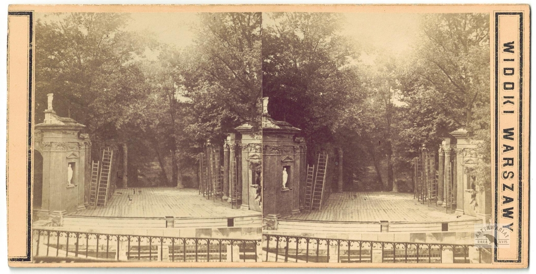 [WARSZAWA - Teatr na Wyspie w Łazienkach Królewskich - fotografia widokowa - stereoskopowa]. [l. 60. XIX w.]. Fotografia form. 8,1x7,4 cm razy dwa na oryg. podkładzie form. 8,6x17 cm, autorstwa Jana Mieczkowskiego w Warszawie.