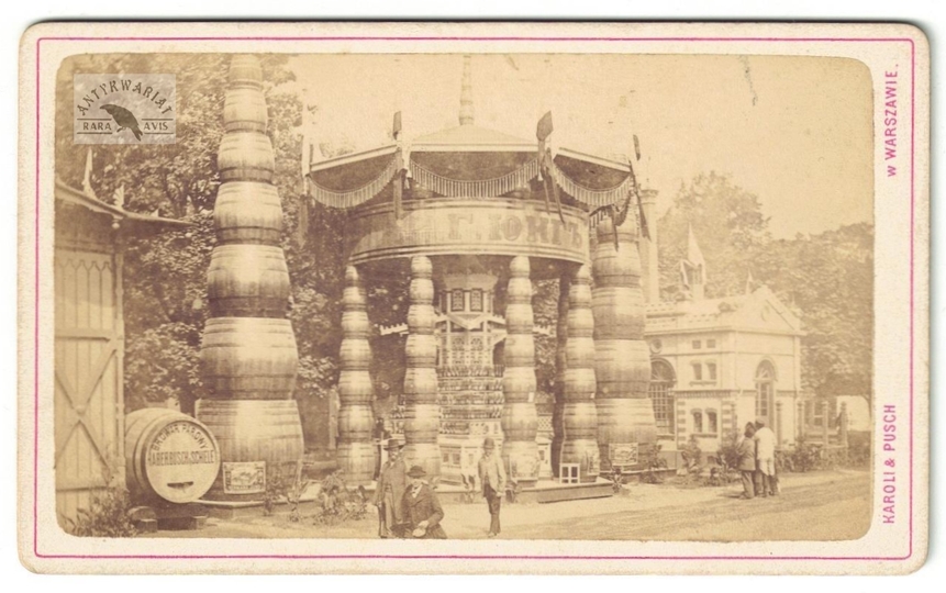 [WARSZAWA - pawilony browarów Władysława Kijoka i Hermana Junga na wystawie - ujęcie w formacie card de visite]. [2. poł. XIX w.]. Fotografia form. 5,5x9,3 cm na oryg. podkładzie form. 6,3x10,5 cm wykonana przez atelier [Aleksandra] Karoli & [Maurycego] Pusch w Warszawie.
