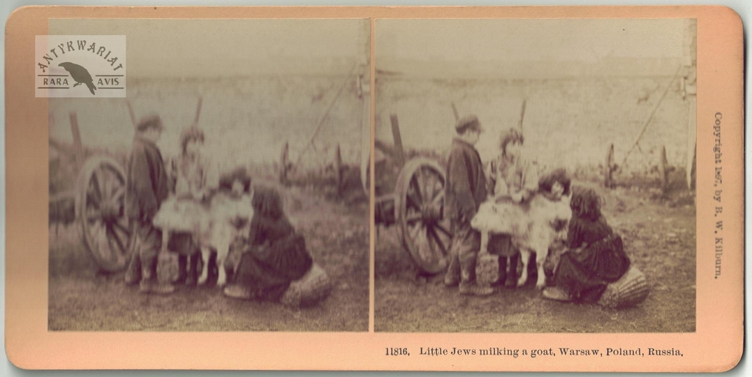[WARSZAWA - żydowskie dzieci dojące kozę - fotografia sytuacyjna, widokowa - stereoskopowa]. [1897]. Fotografia form. 7,7x7,7 cm razy dwa na oryg. podkładzie form. 8,9x17,8 cm, autorstwa Melecjusza Dutkiewicza w Warszawie, wydane przez firmę Kilburn Brothers Stereoscopic View Company w Littleton.