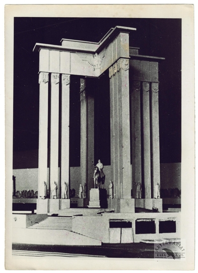 [WARSZAWA - projekt pomnika Józefa Piłsudskiego dla Muzeum Narodowego - fotografia prasowa]. [6 X 1939]. Fotografia form. 18,2x13,1 cm, wykonana na zlecenie niemieckiej Agencji Prasowej Schostal.