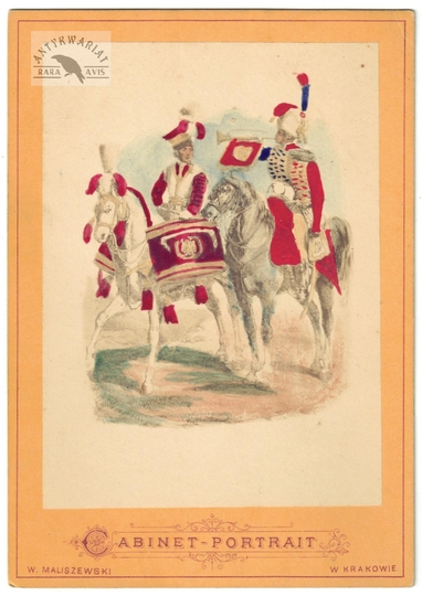 [WOJSKO Polskie Księstwa Warszawskiego i Królestwa Kongresowego - "Dobosz" - ujęcie w formacie wizytowym]. [l. 60. XIX w.]. Fotografia form. 12,6x9,2 cm na oryg. podkładzie form. 15,7x11,1 cm, wykonane w atelier W[alerego] Maliszewskiego w Krakowie.
