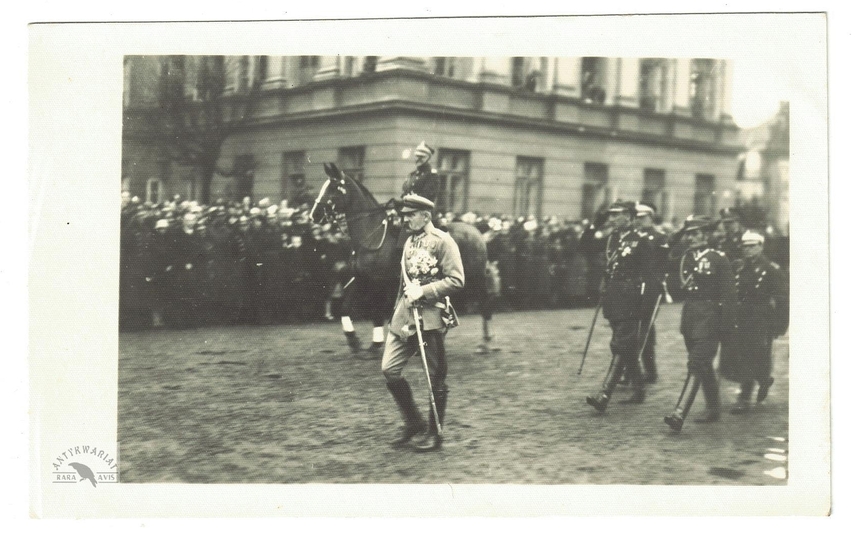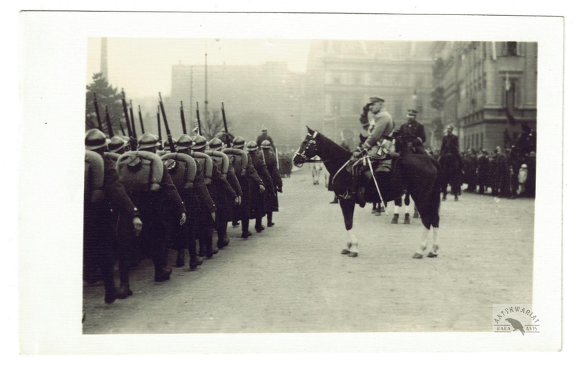 [WOJSKO Polskie - przybycie Marszałka Józefa Piłsudskiego na uroczystości z okazji 8. rocznicy odzyskania niepodległości na placu Saskim w Warszawie - fotografia sytuacyjna]. [11 XI 1926]. Fotografia form. 8,4x13,4 cm.