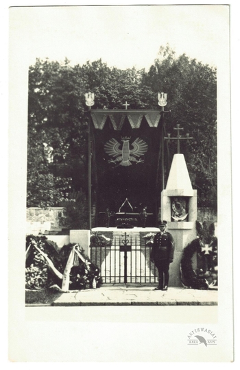 [WOJSKO Polskie - Mauzoleum na Rossie w Wilnie, w którym spoczywa Serce Marszałka Józefa Piłsudskiego i Prochy Jego Matki - fotografia sytuacyjna]. [nie przed 12 V 1936]. Fotografia form. 13,4x8,3 cm.