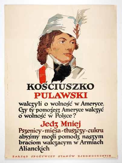 ILLION George John – Kościuszko, Pulawski walczyli o wolność w Ameryce. Czy ty pomożesz Ameryce walczyć o wolność w Polsce? Jedz mniej pszenicy, mięsa, tłuszczy, cukru abyśmy mogli pomodz naszym braciom walczacym w Armiach Alianckich. [1917?].