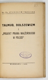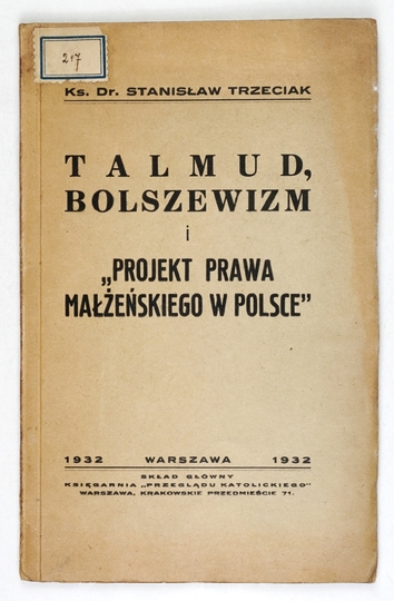 TRZECIAK Stanisław – Talmud, bolszewizm i "Projekt prawa małżeńskiego w Polsce". Warszawa 1932. Skł. gł. Księgarnia "Przeglądu Katolickiego". 8, s. 57, [5]. brosz.