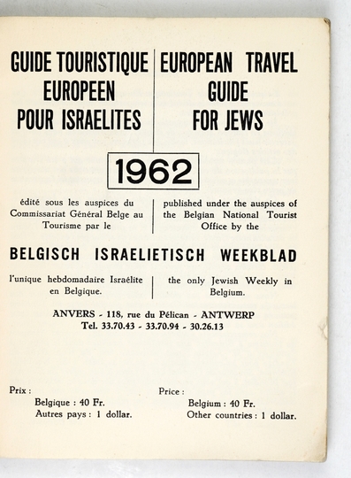 EUROPEAN Travel Guide for Jews published under the auspices of the Belgian National Tourist Office. Antwerp 1962. Belgisch Israelietisch Weekblad. 16d, s. 140. brosz.