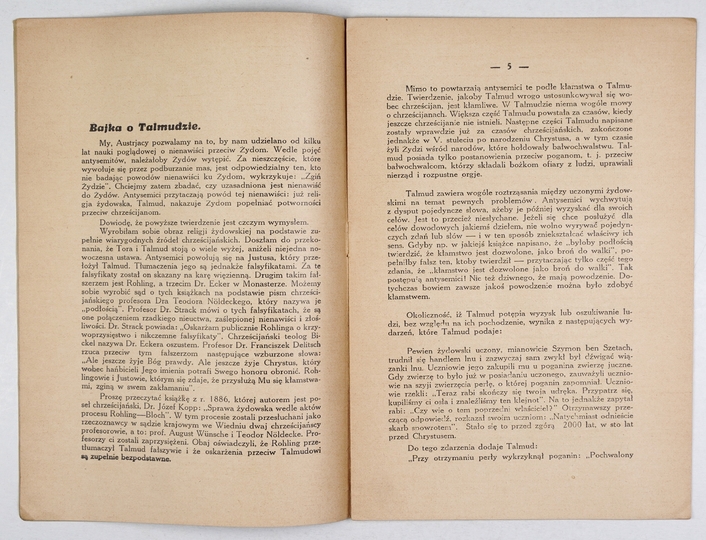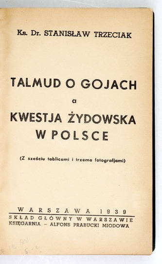 TRZECIAK Stanisław – Talmud o gojach a kwestja żydowska w Polsce. (Z sześciu tablicami i trzema fotografjami). Warszawa 1939. Skł. gł. Księg. Alfons Prabucki. 8, s. 379, tabl. 1. opr. pł. z epoki.