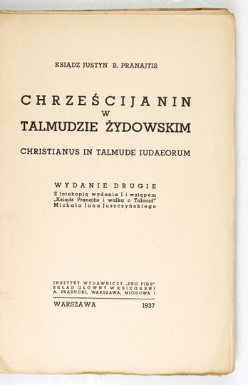 PRANAJTIS Justyn B. – Chrześcijanin w Talmudzie żydowskim. Christianus in Talmude iudaeorum. Wyd. II. Z fotokopją wydania I i wstępem "Ksiądz Pranajtis i walka o Talmud" M. J. Juszczyńskiego. Warszawa 1937. Instytut Wyd. "Pro Fide". 8, s. [2], 334, [2]. brosz.