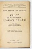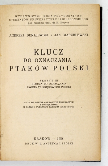DUNAJEWSKI Andrzej, MARCHLEWSKI Jan – Klucz do oznaczania ptaków Polski. Zesz. III Klucza do oznaczania zwierząt kręgowych Polski. Wyd. II całkowice przerobione i powiększone. Kraków 1938. Wyd. Koła Przyrodników Studentów Uniw. Jagiellońskiego. 16d, s. 338. opr. ppł. z epoki.