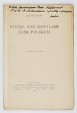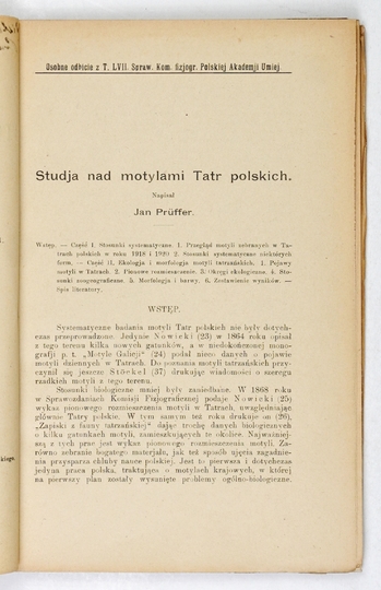 PRUFFER Jan – Studja nad motylami Tatr Polskich. (Z dwiema tablicami). Kraków 1923. PAU. 8, s. [2], [89]-170, tabl. 2. brosz. Odb. ze "Sprawozdań Komisji Fizjograficznej".