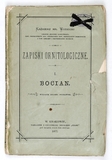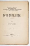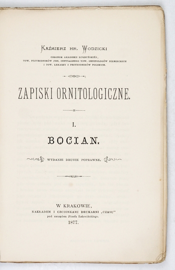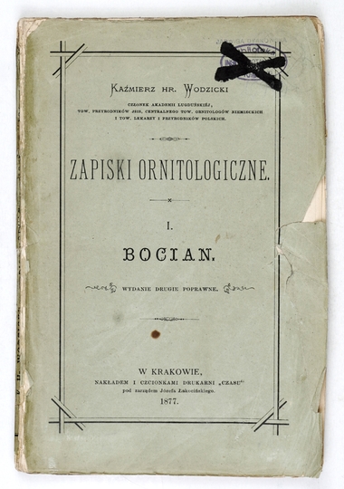 WODZICKI Kazimierz – Zapiski ornitologiczne. T. 1: Bocian. Wyd. II poprawne. Kraków 1877. Nakł. "Czasu". 16d, s. XV, [1], 91. brosz.