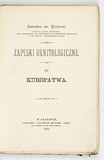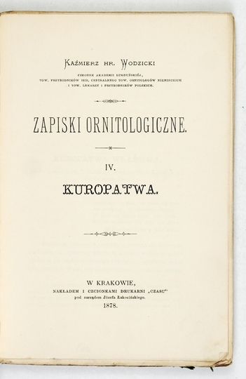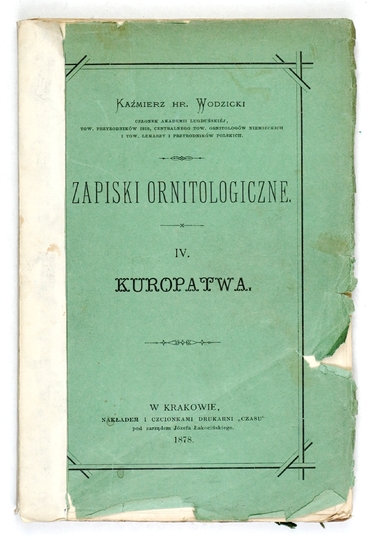 WODZICKI Kazimierz – Zapiski ornitologiczne. T. 4: Kuropatwa. Kraków 1878. Nakł. "Czasu". 16d, s. [4], 231. brosz.