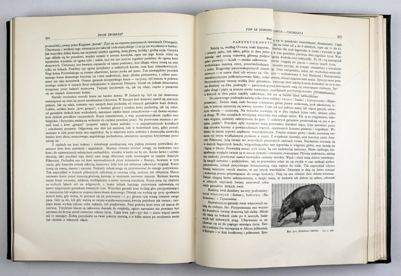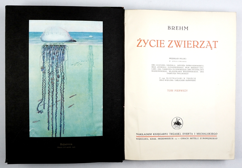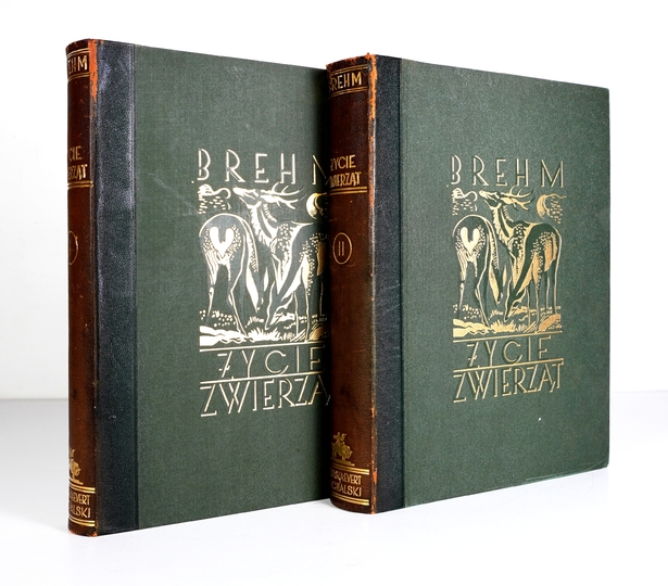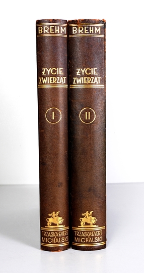 BREHM [Alfred Edmund] – Życie zwierząt. Przekład polski w oprac. Gustawa Dehnela, Janusza Domaniewskiego [i in.]. Z 1090 ilustracjami w tekście oraz wieloma tablicami barwnemi. T. 1-2. Warszawa [1935-1936]. Księg. Trzaski, Everta i Michalskiego. 4, s. XXVII, [1], 442, tabl. 8; XVIII, [2], 531, tabl. 10. opr. oryg. psk. złoc., oryg. futerał kart.