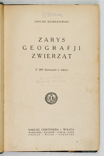 DOMANIEWSKI Janusz – Zarys geografji zwierząt. Z 200 ilustr. w tekście. Warszawa [1923]. Gebethner i Wolff. 8, s. 266, [2]. opr. ppł. z epoki.
