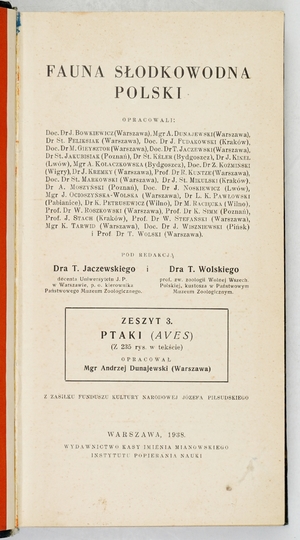 DUNAJEWSKI Andrzej – Fauna słodkowodna Polski. Zesz. 3: Ptaki (Aves). (Z 235 rys. w tekście). Warszawa 1938. Kasa im. Mianowskiego. 8, s. 426. opr. ppł. z epoki z zach. okł. brosz.