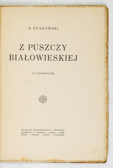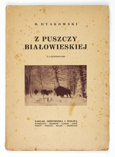 DYAKOWSKI B[ohdan] – Z Puszczy Białowieskiej. Z 8 ilustracjami. Warszawa 1926. Gebethner i Wolff. 8, s. 123, [1]. brosz.