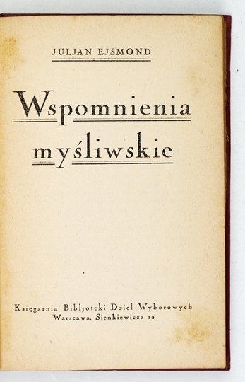 EJSMOND Juljan – Wspomnienia myśliwskie. Warszawa [1925]. Bibliot. Dzieł Wyborowych. 16d, s. 157, [3]. opr. oryg. pł.